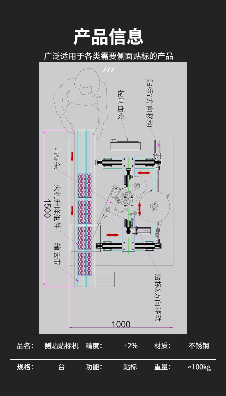 全自動側面貼標機,適用于需要側面貼標機的產品,整機采用304不銹鋼,耐腐耐用。配備PLC觸摸屏,智能控制程序。支持來樣試機